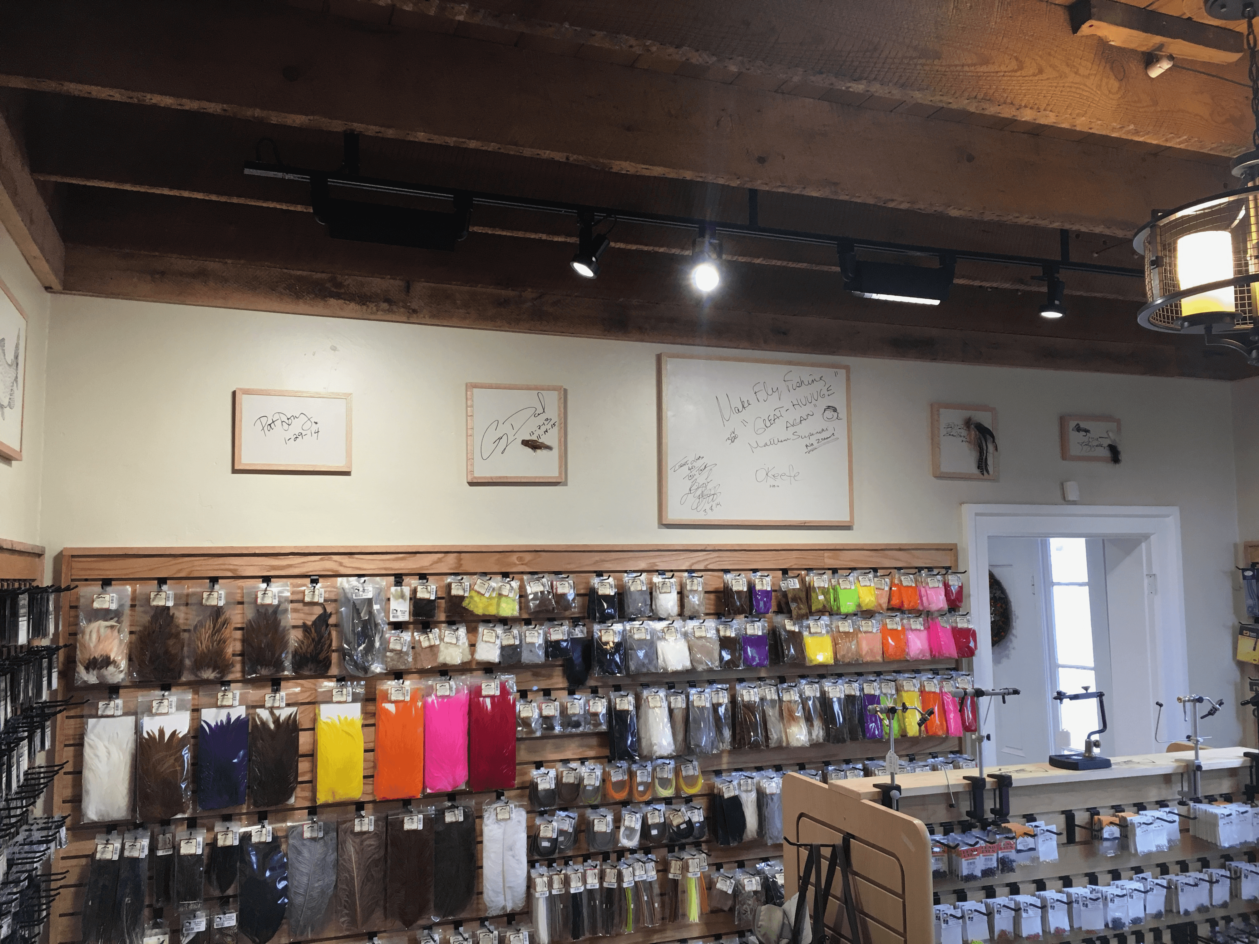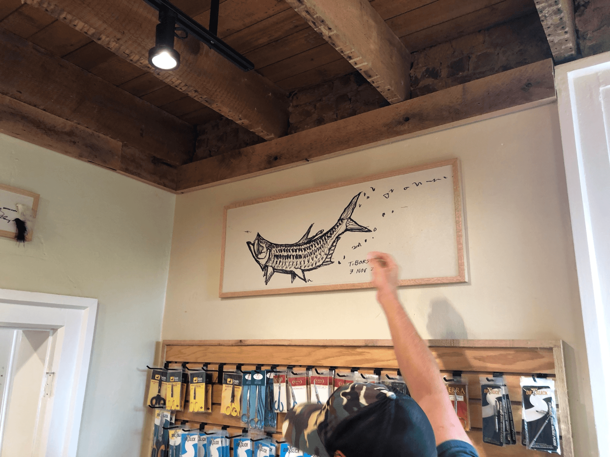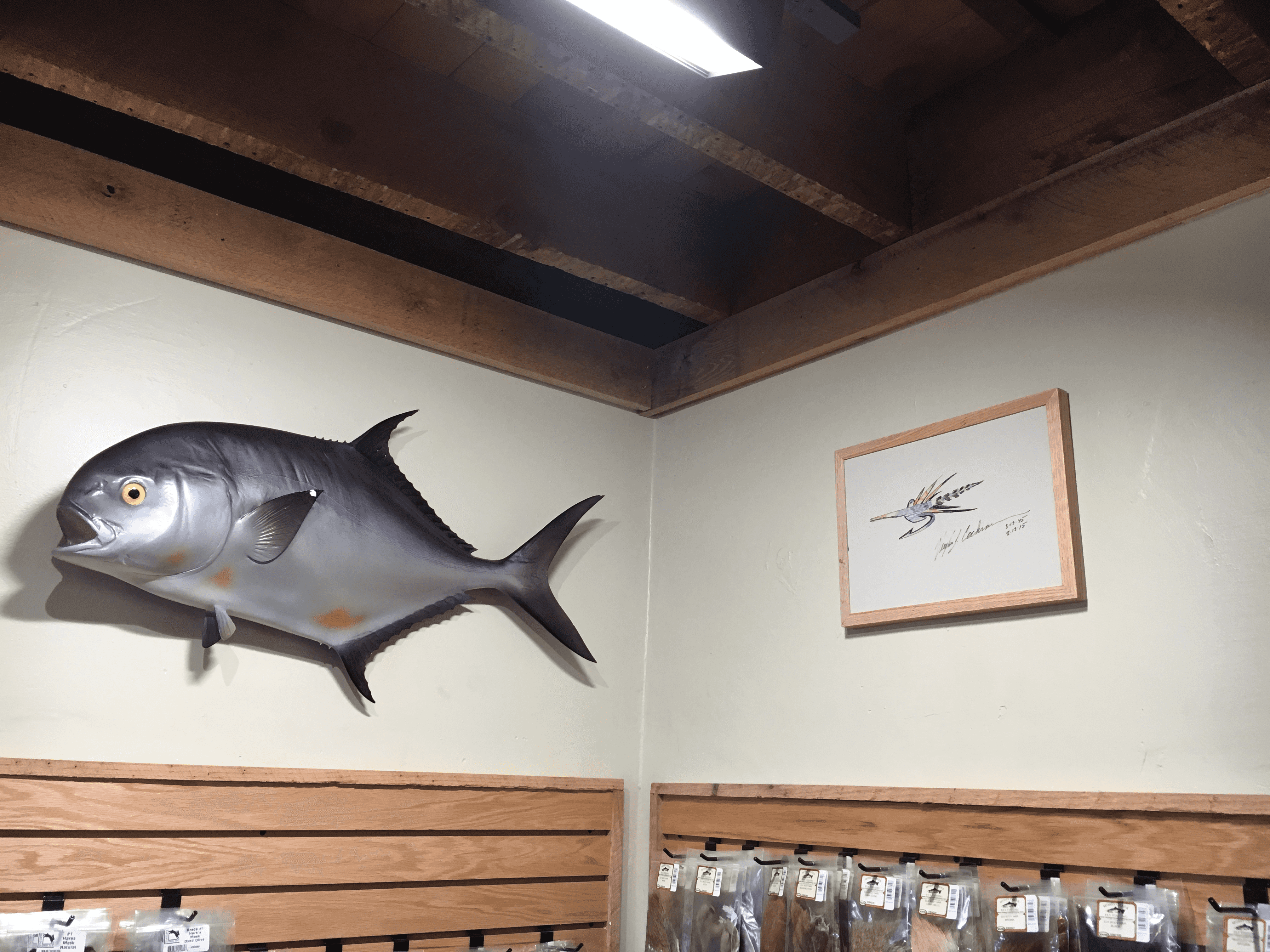 More frames went up, and suddenly there was a gallery wall taking shape among the bins of fly tying materials.