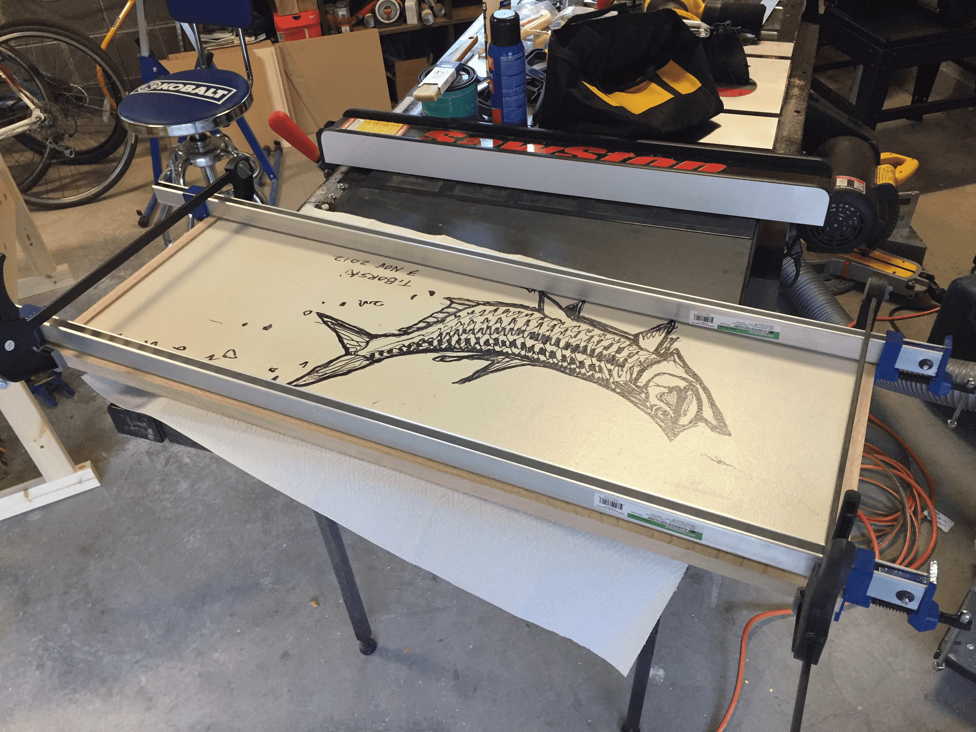 The larger pieces, like this tarpon drawing, required some creative clamping solutions.
