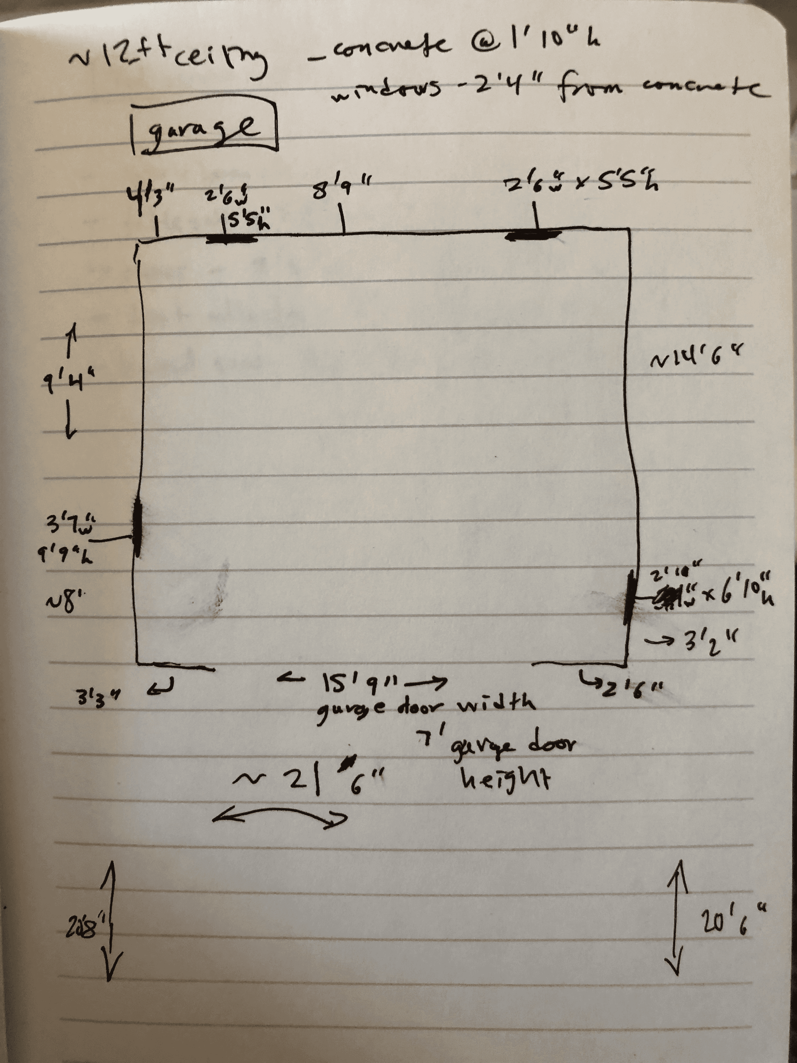 Every good project starts with a plan. I sketched out the garage dimensions, noting window locations and the garage door opening. The goal was to maximize usable wall space while improving the overall work environment (and leaving a space for my car).
