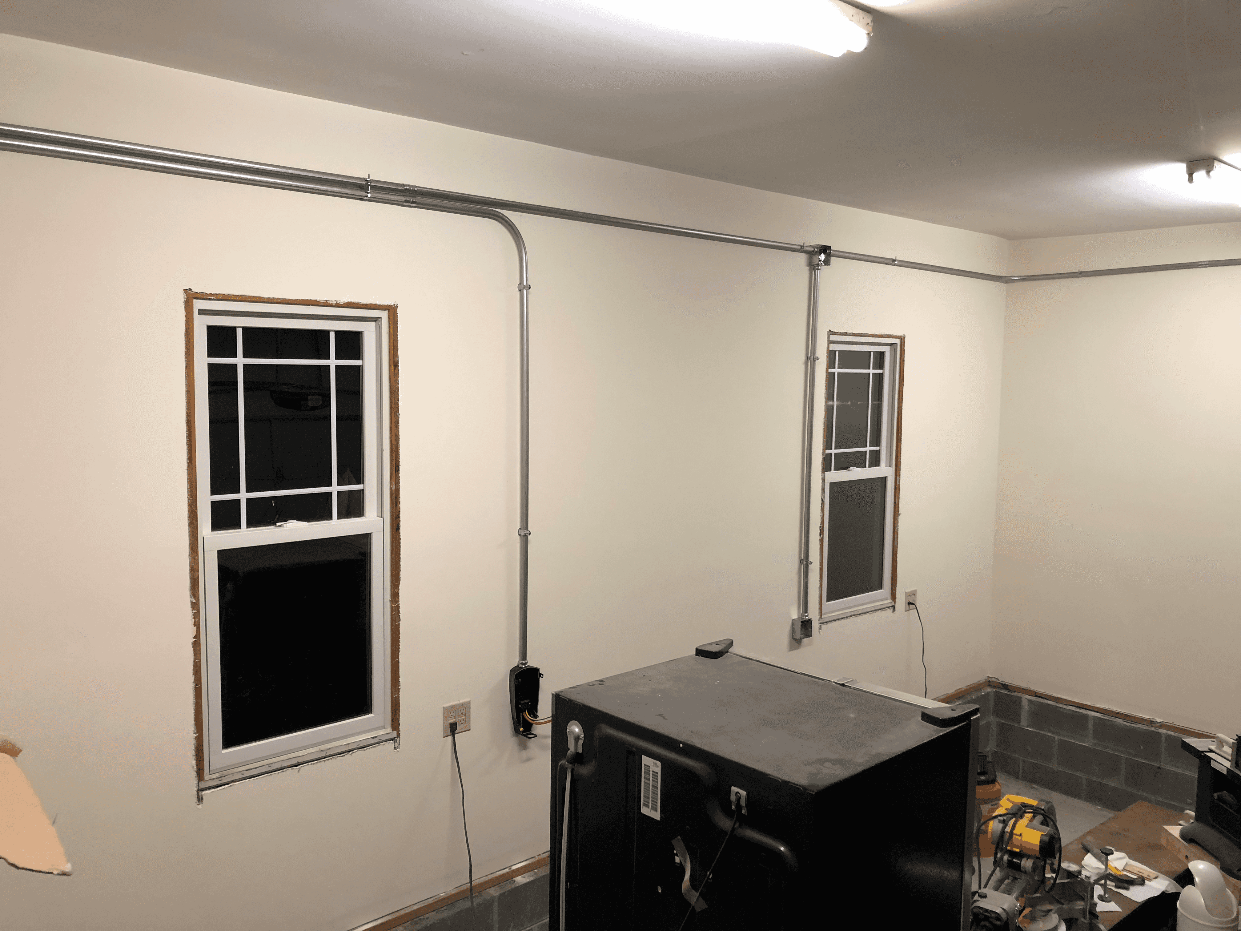 With the walls ready, an electrician ran new circuits in surface-mounted conduit. More outlets meant no more extension cords snaking across the floor. A dedicated 240V circuit was left in case I needed to upgrade anything in the future.