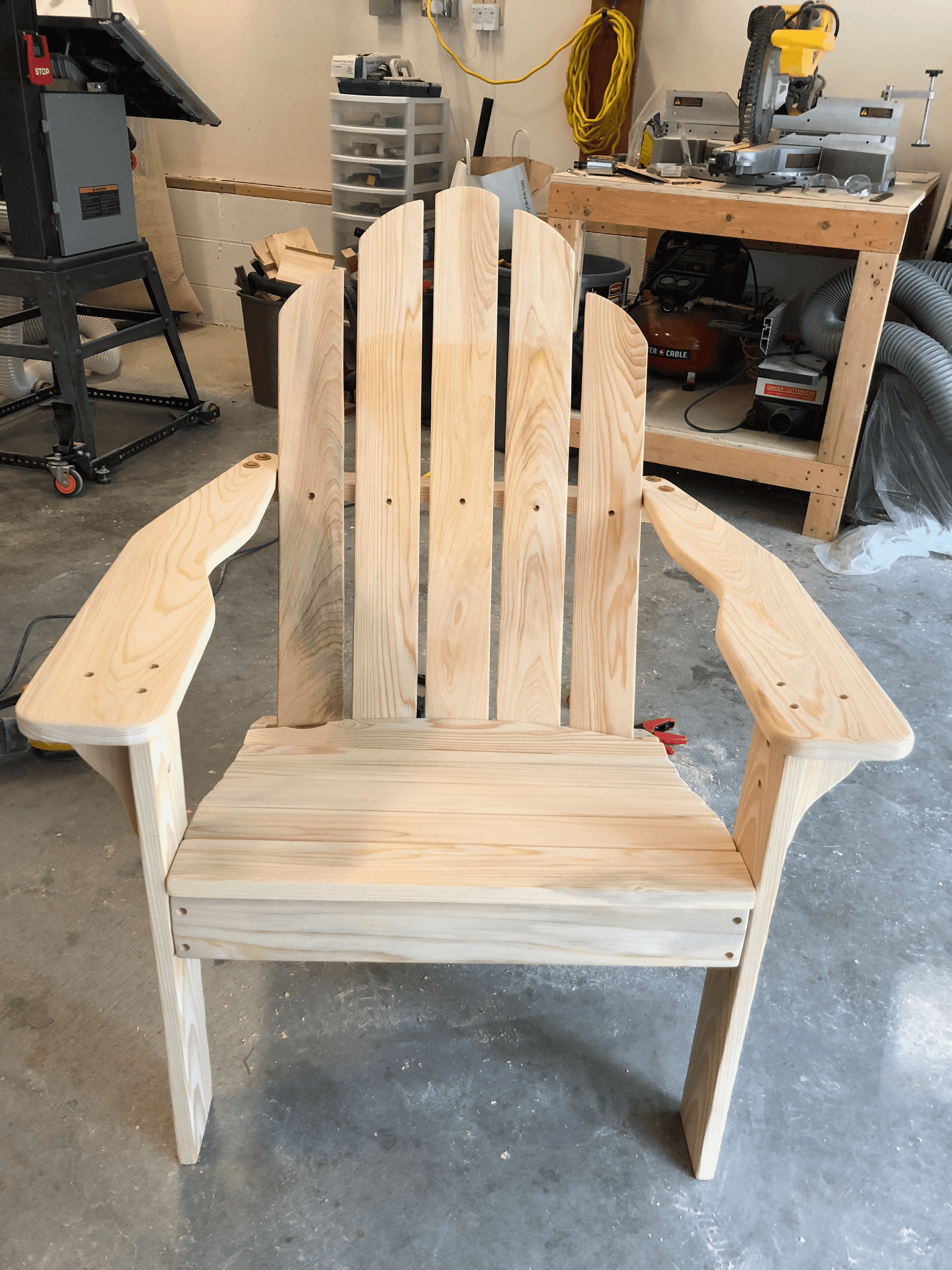 The first chair complete and ready for a test sit. The curved back slats and wide armrests are what make an Adirondack an Adirondack. Plenty of room for a drink on that armrest.