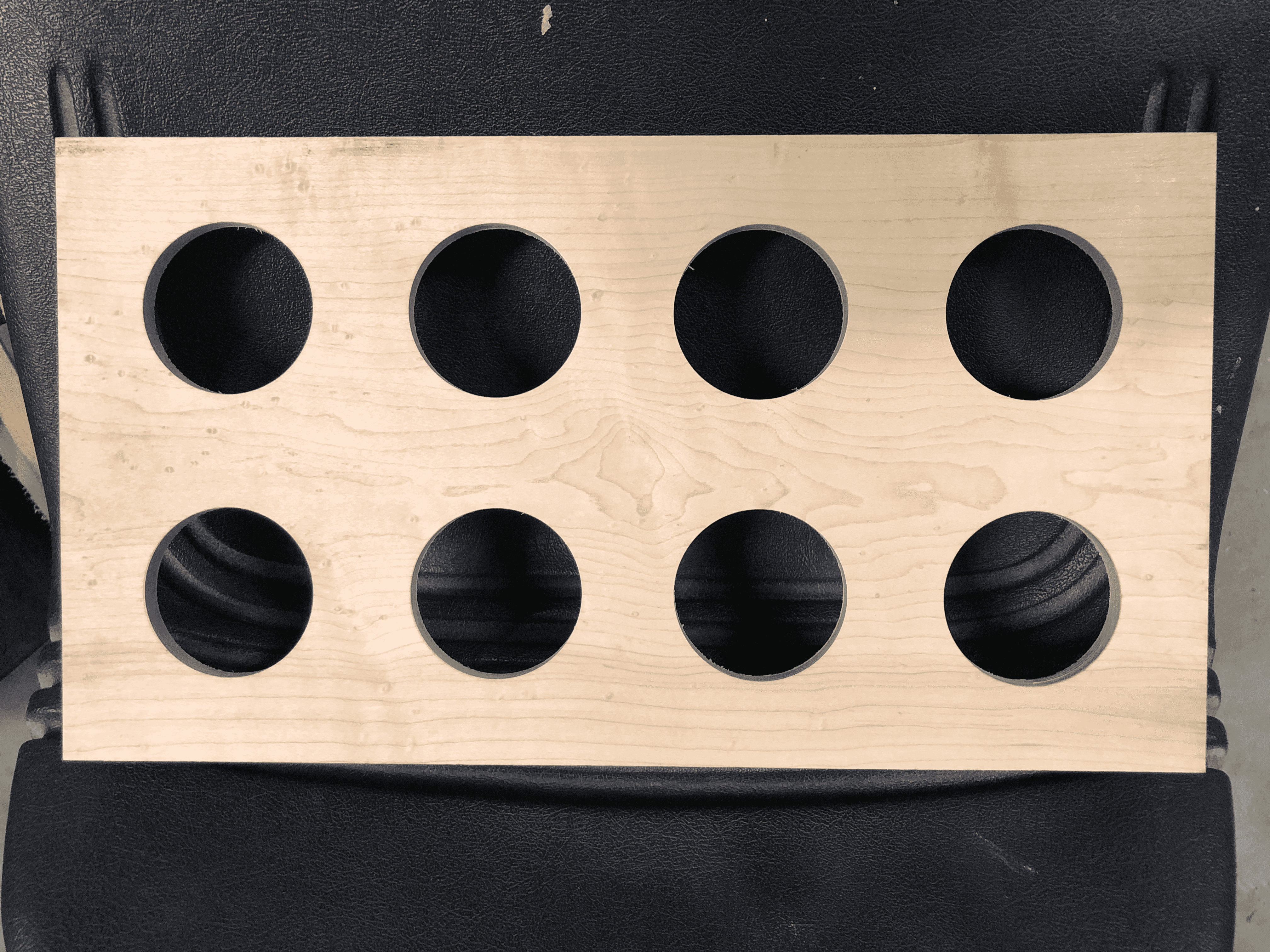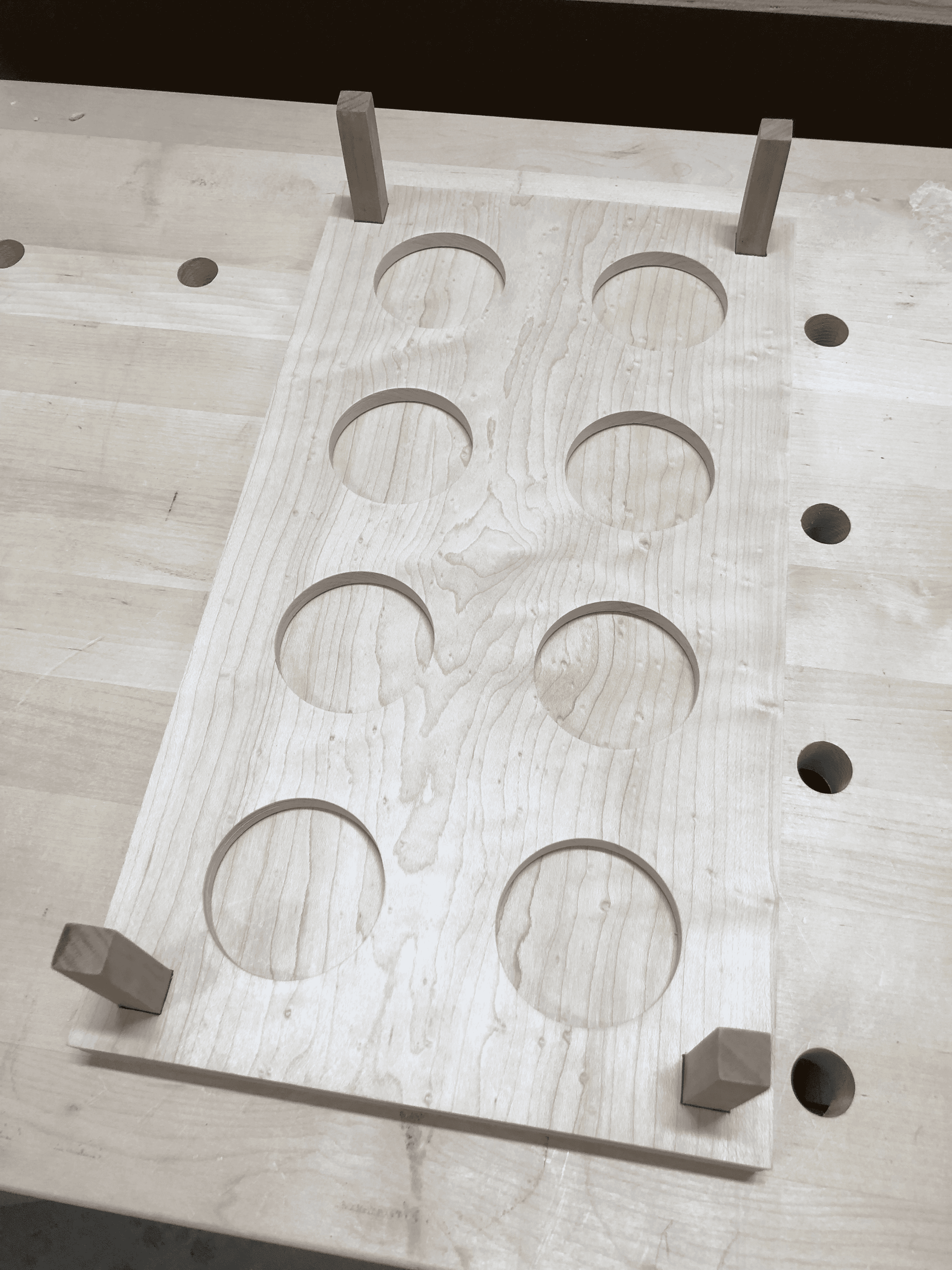 The design started with a piece of curly maple - those shimmering waves in the grain would really pop under finish. Eight holes sized exactly to fit my tasting glasses, cut with a forstner bit on the drill press.