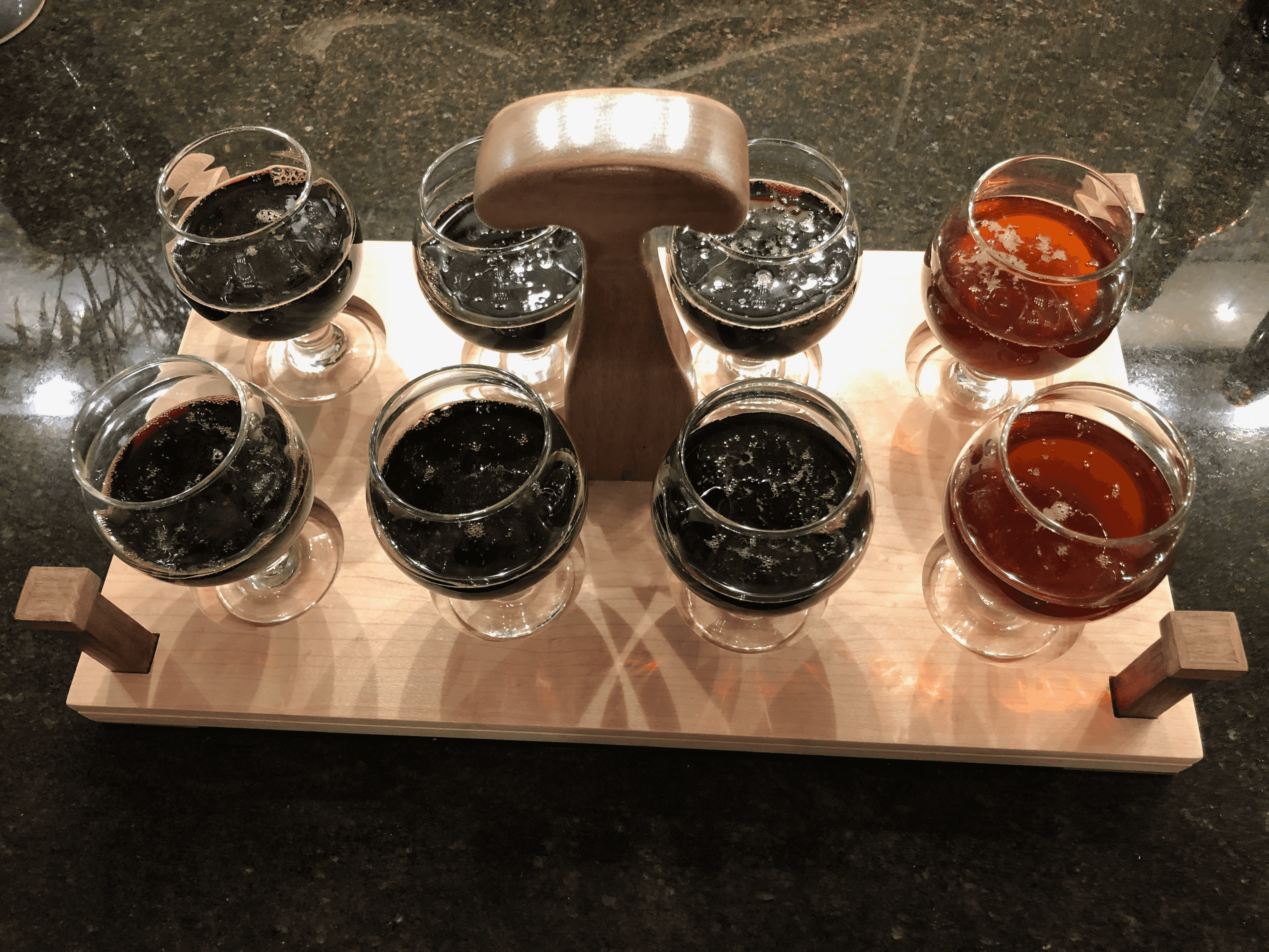 The finished flight cart in action, loaded up with a variety from dark stouts. The curly maple catches the light beautifully, and the walnut accents tie it all together.