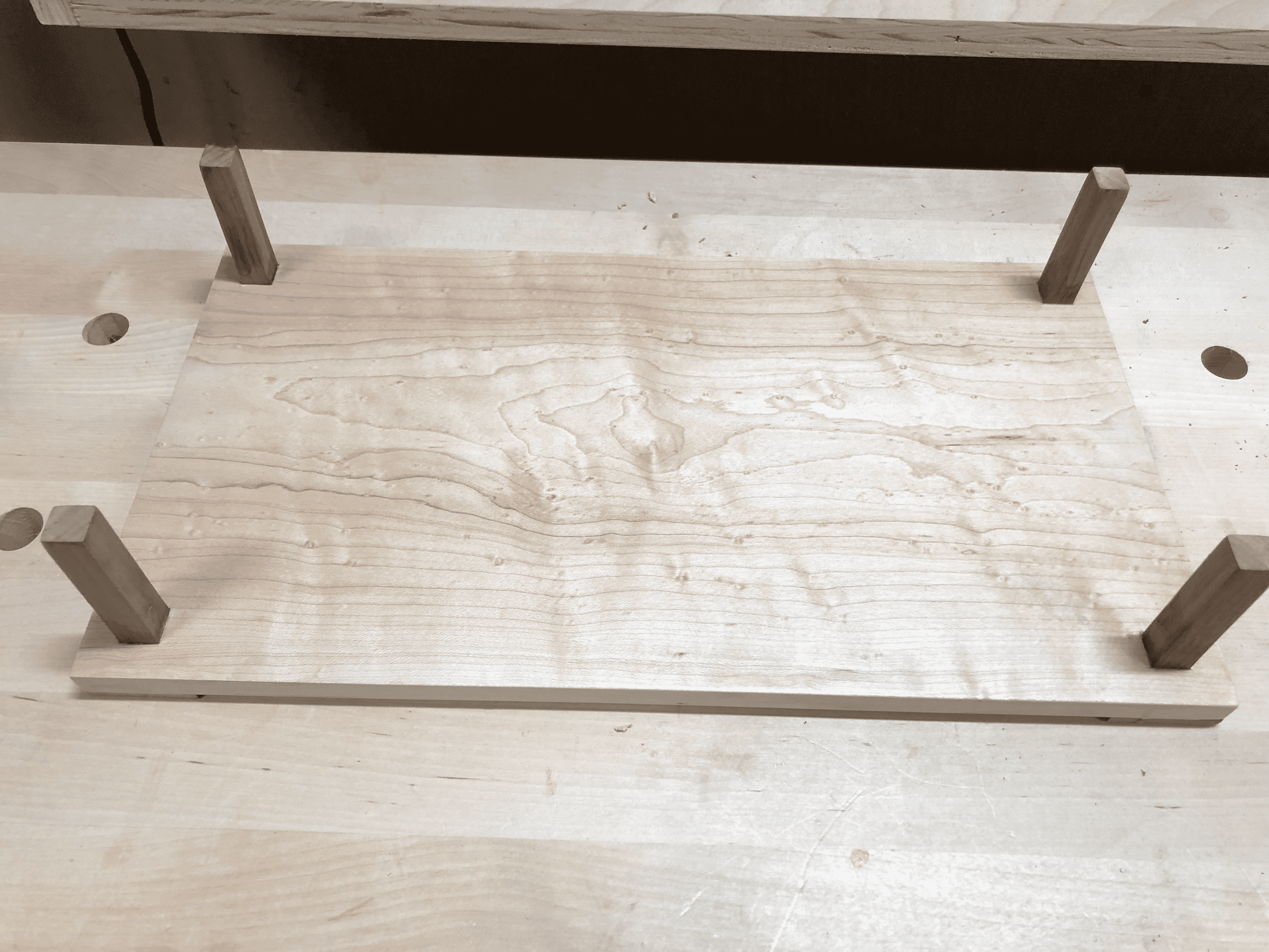 Walnut feet elevated the board slightly, providing clearance for carrying and a nice visual contrast against the light maple. The curly figure in the maple really started to show as the finish went on.
