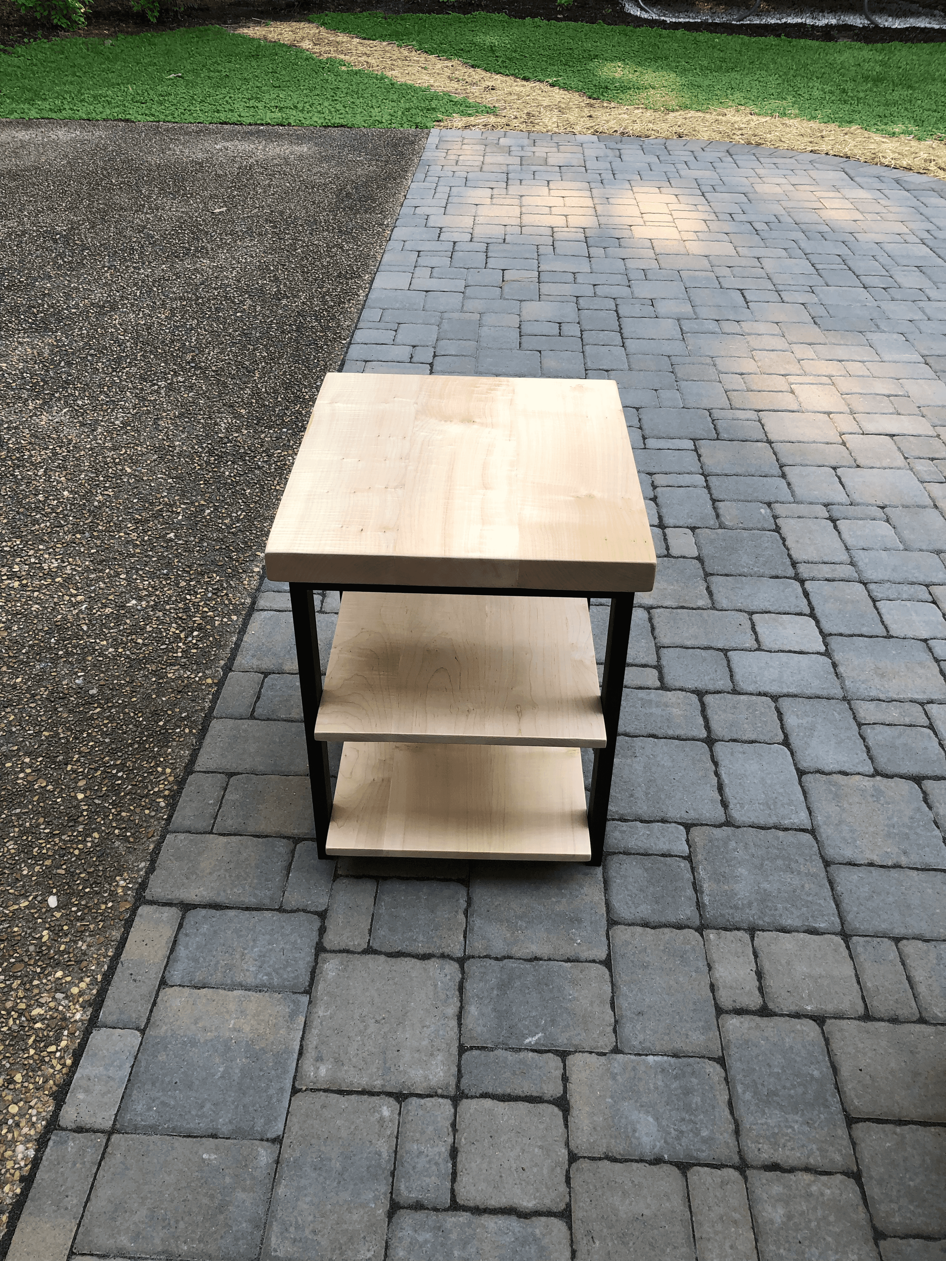 The finished table with black ink poly legs providing contrast to the light maple. Three tiers meant plenty of storage while maintaining visual openness. The industrial-modern mix worked well.