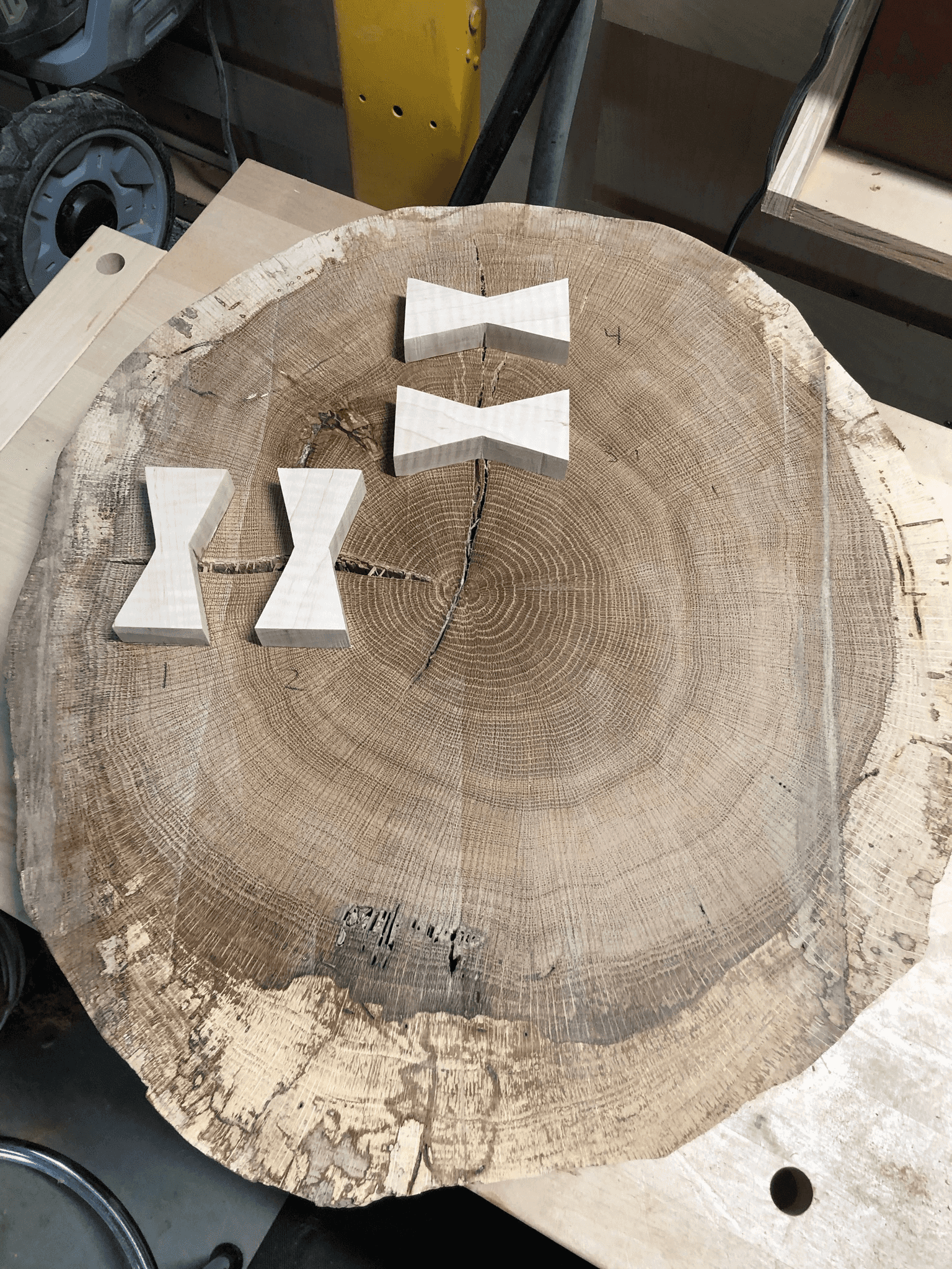 Remember those wood cookies from my parent oak tree? After proper drying time, they were finally ready to become furniture. The challenge: those beautiful growth rings came with some cracks that needed addressing.