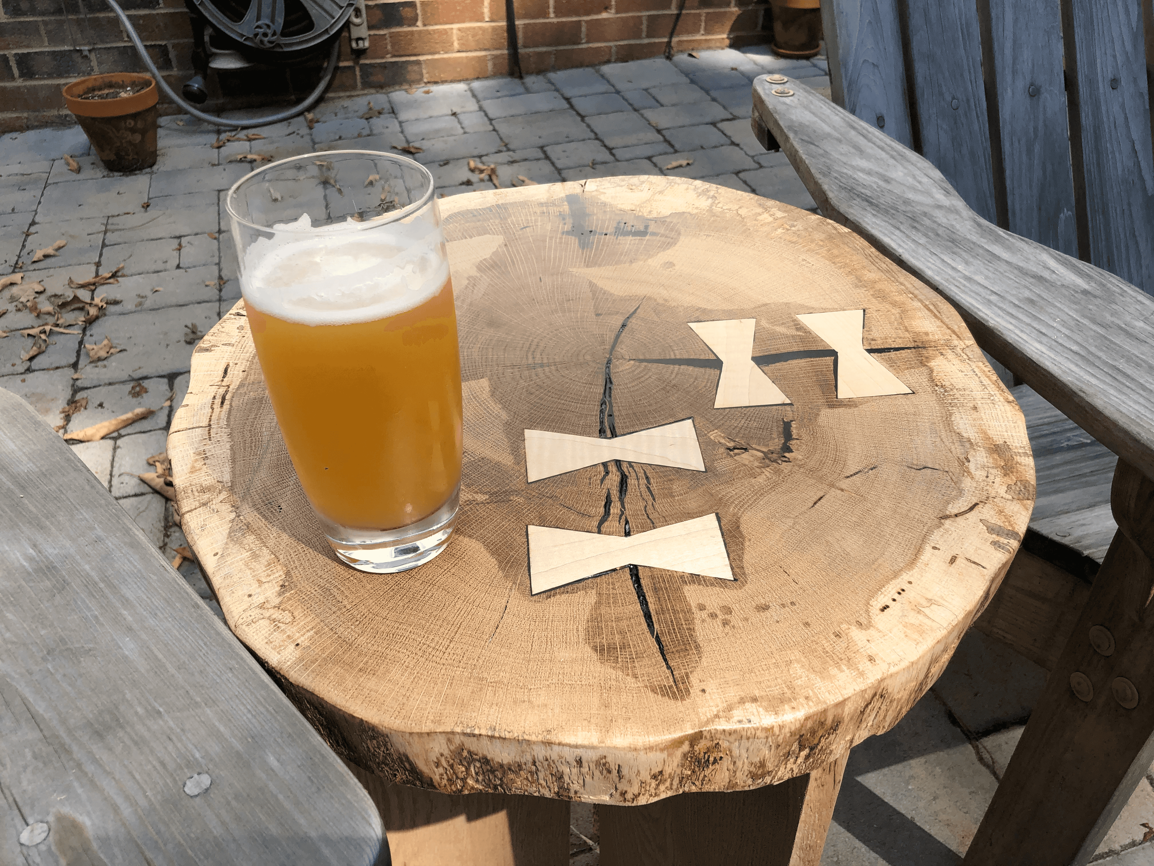 On the patio between the Adirondacks, the cookie table found its purpose. The growth rings tell decades of the tree’s story, preserved now as a useful surface. The bowtie joints have become a feature, not just a fix. And for those in the know, there is a secret pop-top attached to a magnet under the table top.