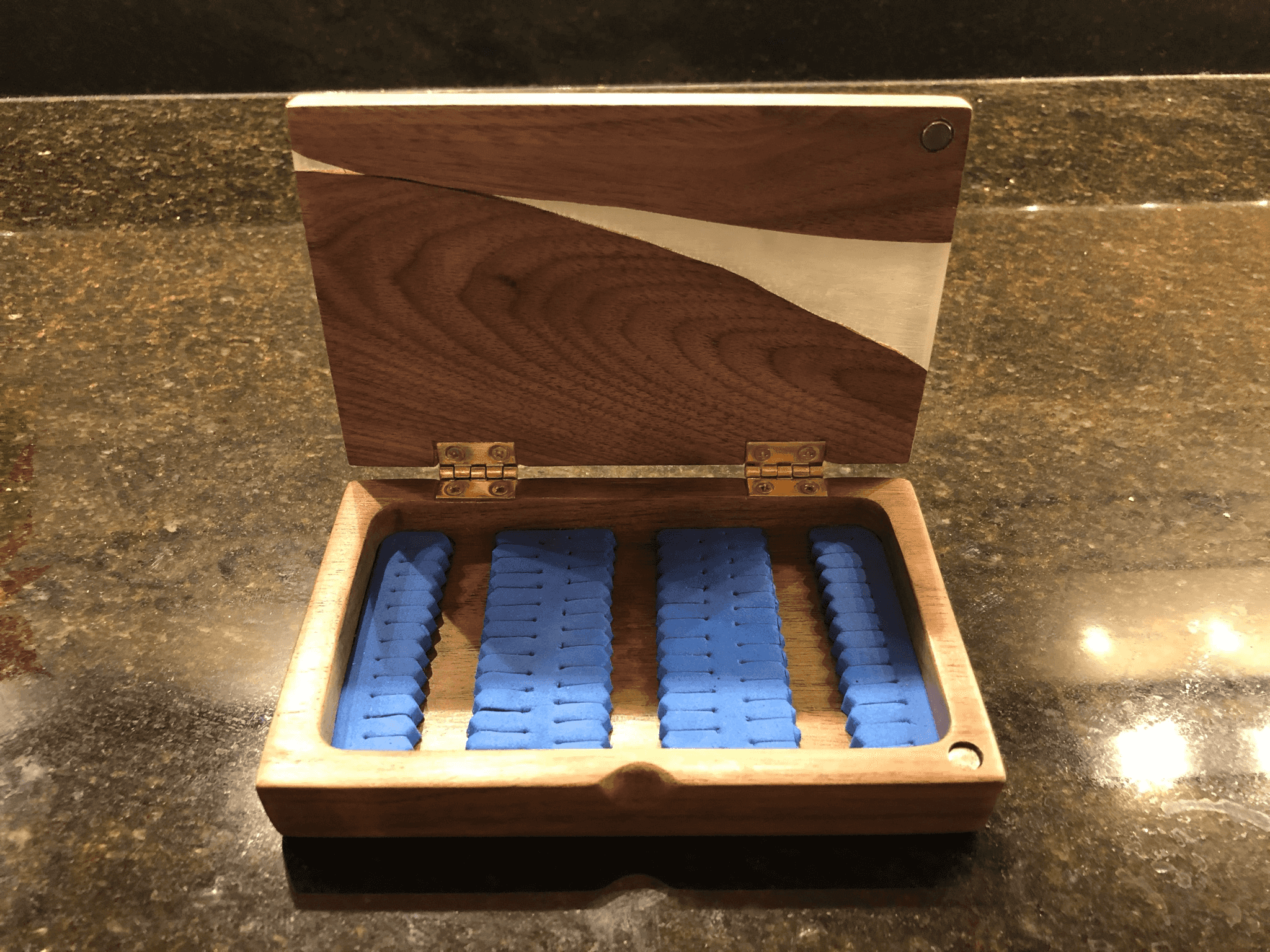 The finished product: a walnut box with epoxy accents, brass hinges, and slit foam ready to hold flies. Magnetic closure keeps everything secure while wading in a river. A few of the boxes has the epoxy surface gouged to look like rippling water.