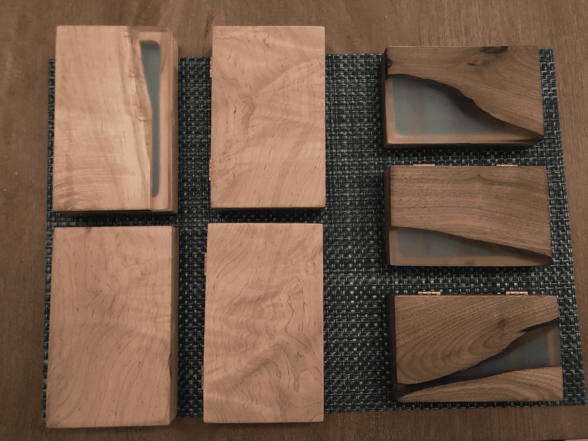 The lids were where the magic happened. Walnut pieces with natural voids and live edges became canvases for epoxy river pours. Each crack and void was an opportunity for color.